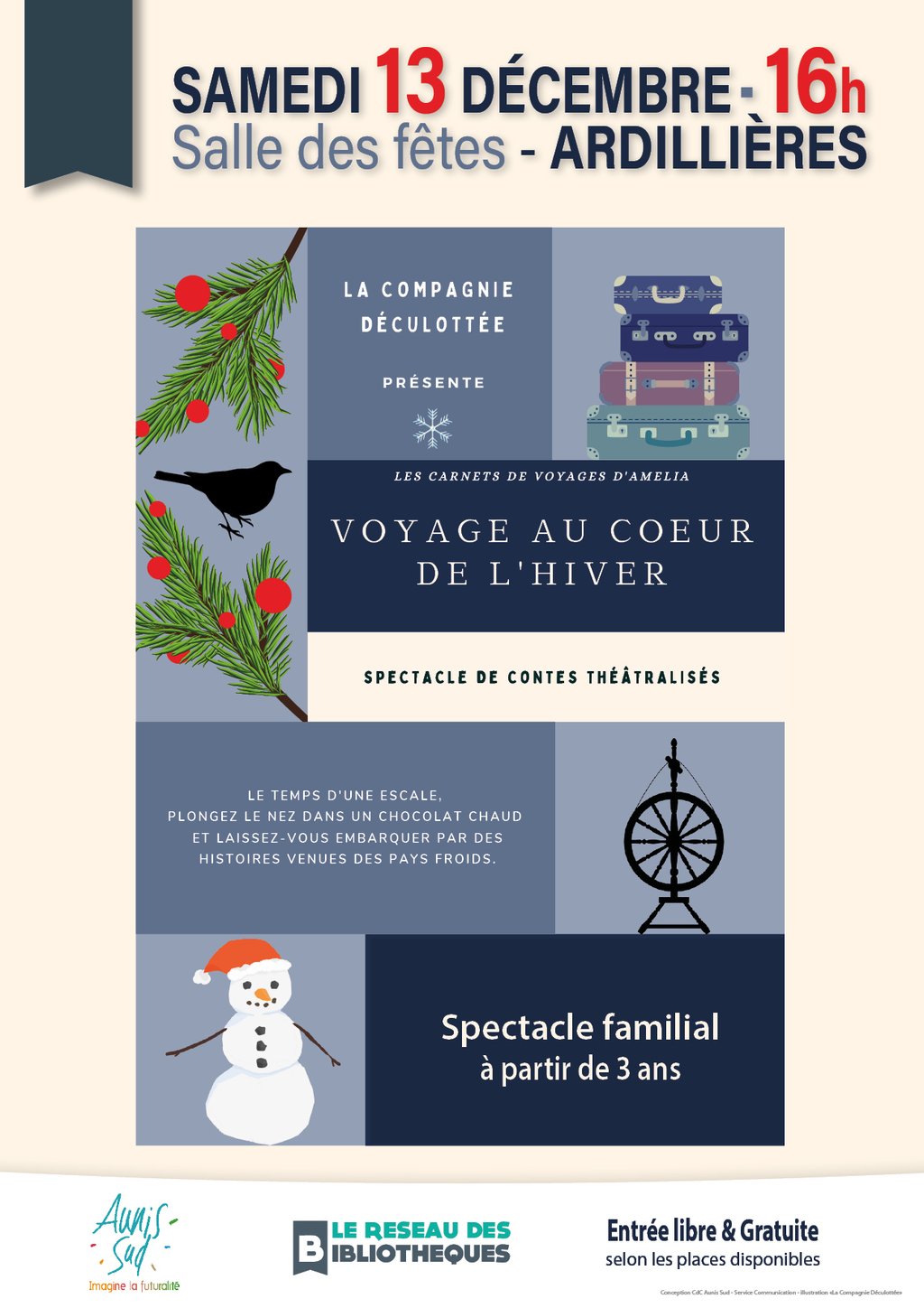 Samedi 13 décembre, le réseau des bibliothèques Aunis Sud vous donne rendez-vous à la salle des fêtes d’Ardillières pour un moment convivial et chaleureux.
